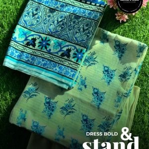 - Trouser Fabric: The trouser piece is a solid, light blue fabric, providing a cohesive look and balancing the patterned top.